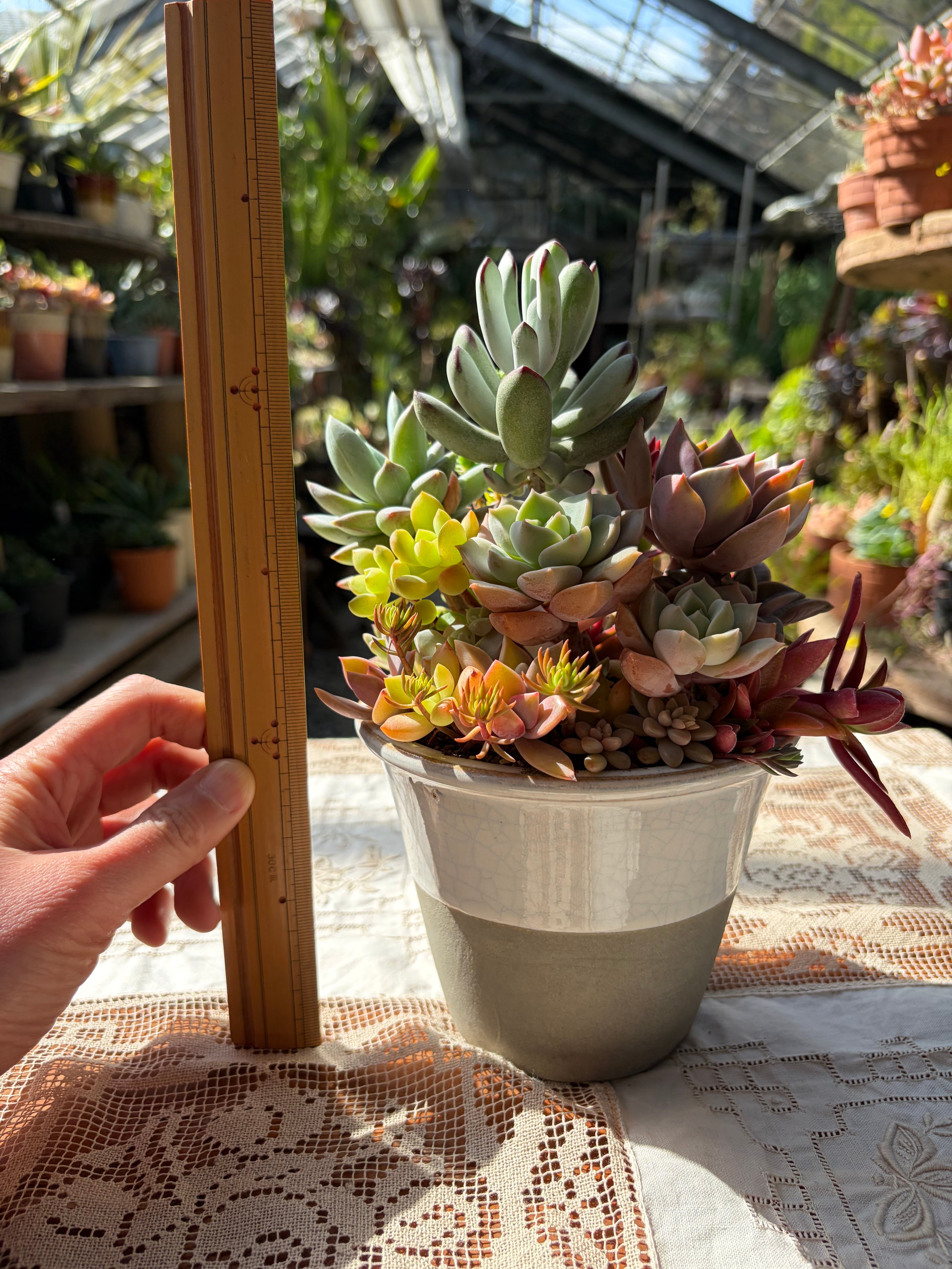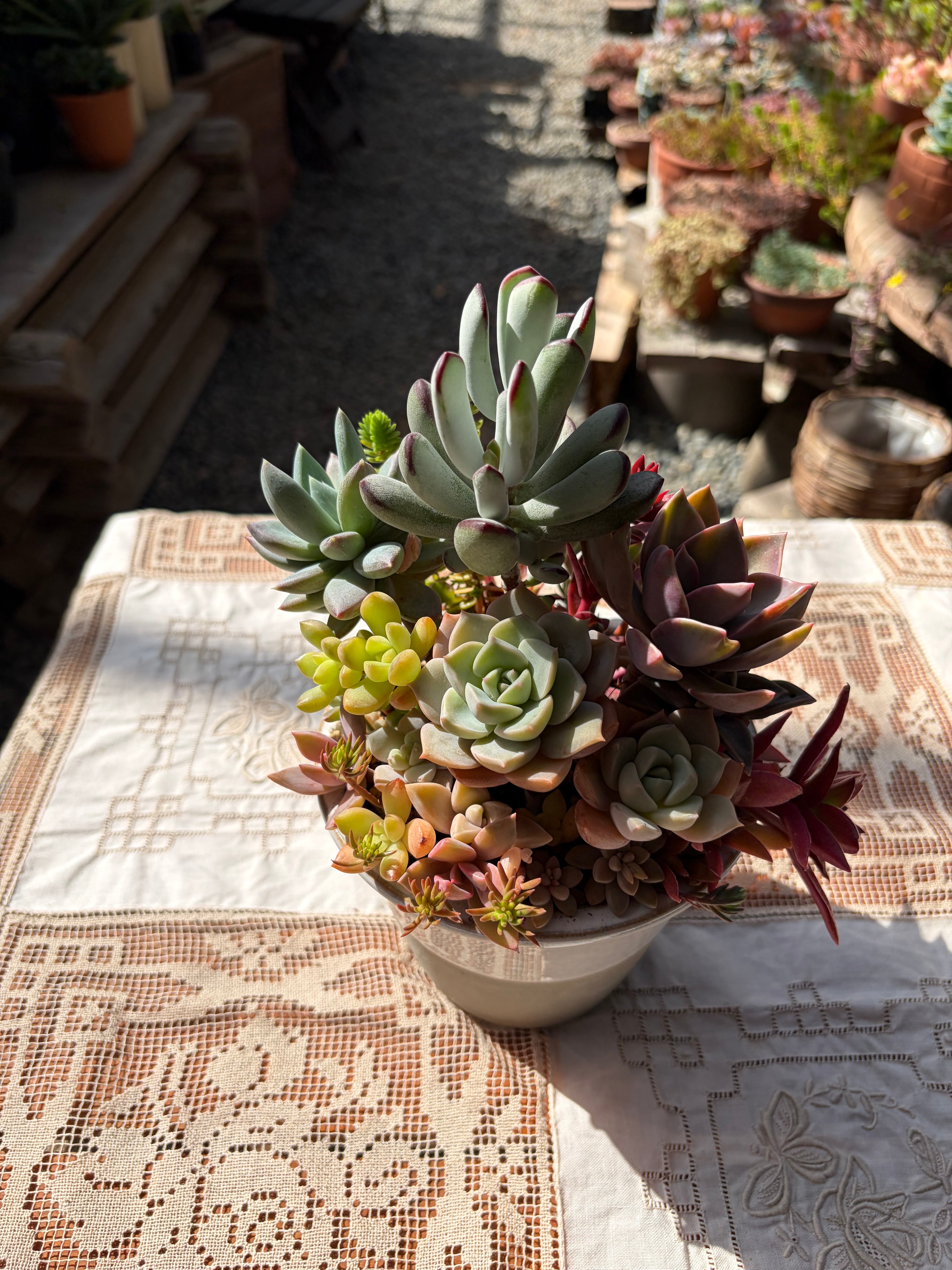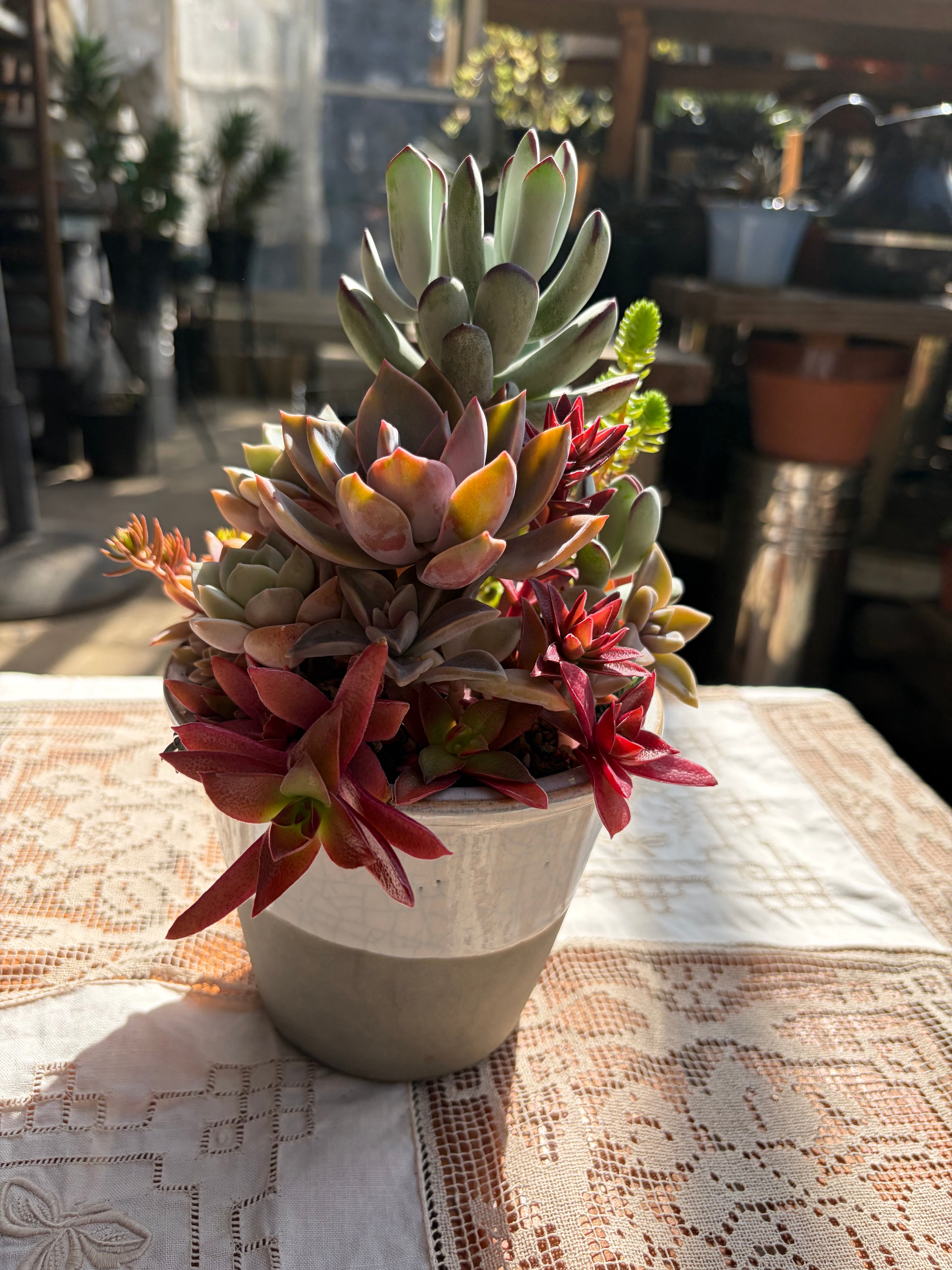 自家栽培の多肉植物を使った美しいアレンジメントです。陶製の白グレーポットに、福娘、ヒアリウム、白牡丹、火祭り、パープルキングなどさまざまな種類の多肉植物が調和よくまとめられています。ユニークな葉色と形状の多肉たちが、部屋に独自のアクセントを加えます。