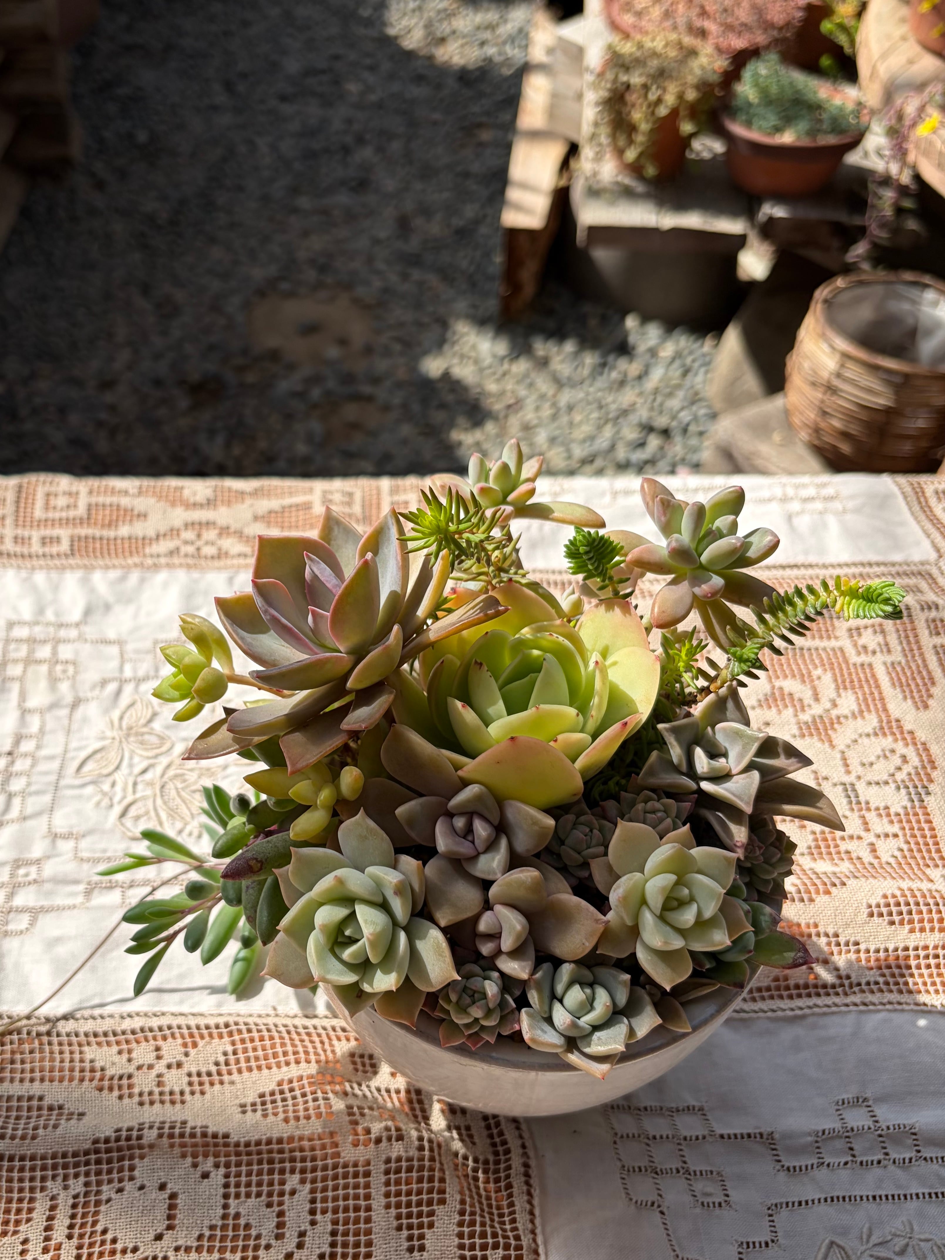 美しい多肉植物を使った、多肉アレンジメント陶白グレーマ丸ポットです。