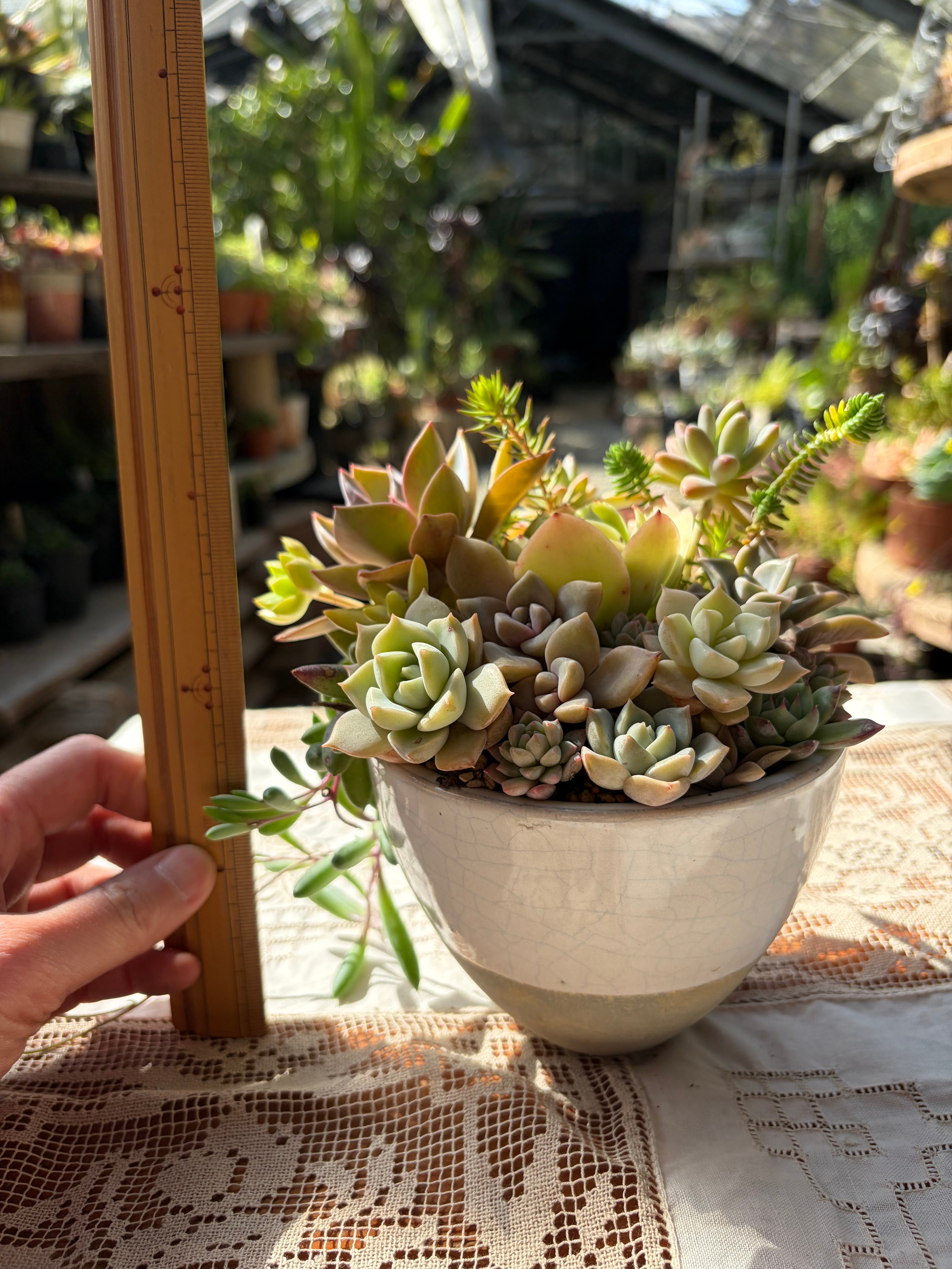 ピーチプリデ、パープルキング、白牡丹、ルビーネックレス、プロリフィカなど色とりどりの多肉植物が調和よくまとめられ、独特の葉色や形状が空間に魅力を加えます。心が癒される素敵なアクセントとして、さまざまなインテリアにマッチします。