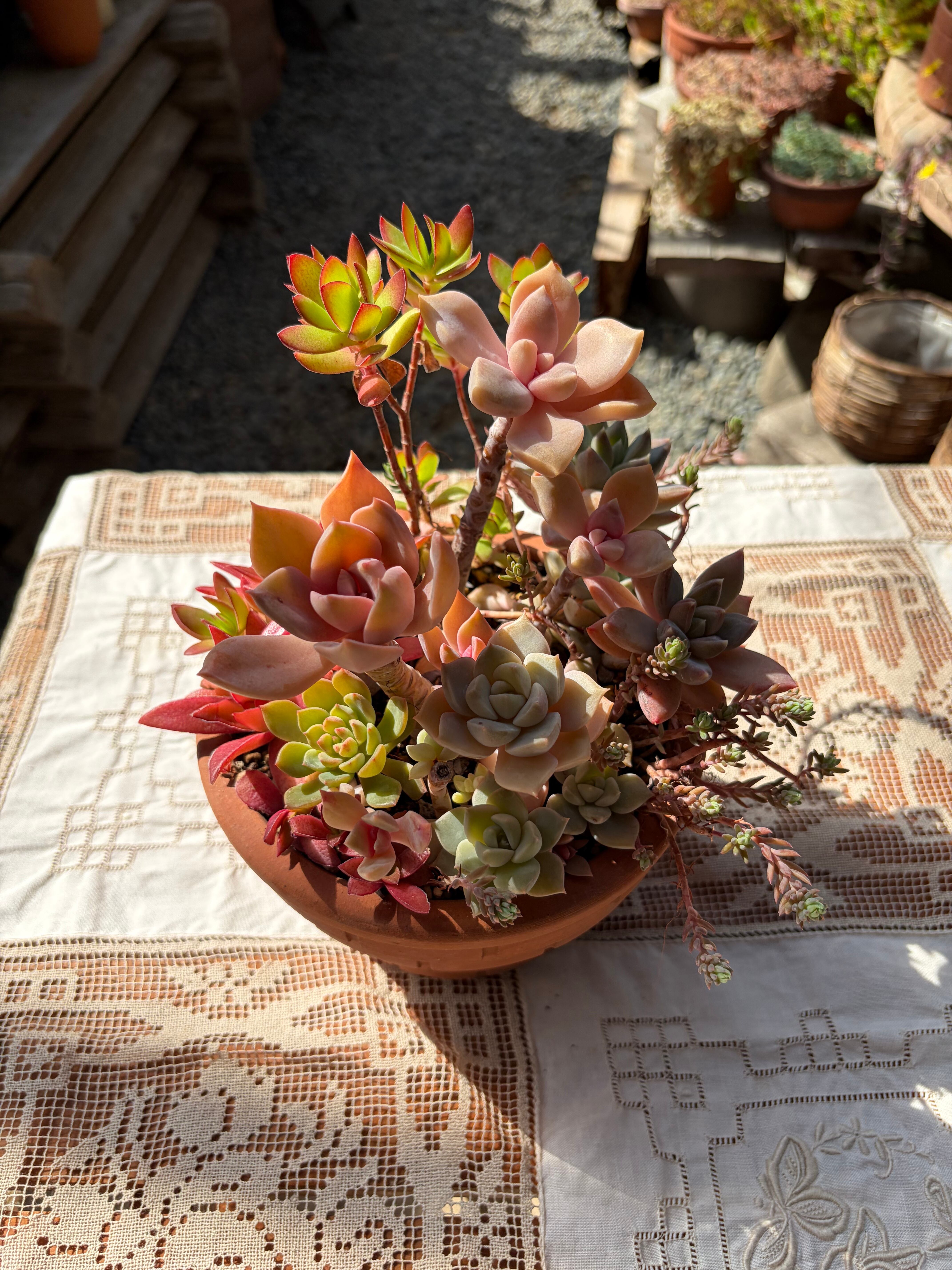 美しい多肉植物を使った、テラコッタレンガ柄のアレンジメントです。植えられている多肉たちは、天狗の舞、ヒアリウム、淡雪、火祭りセダム類などで、さまざまな葉色と形状が調和しており、インテリアに温かみを添えます。どんな空間にもなじむデザインで、心を癒してくれる素敵なアイテムです。紅葉でより特徴がはっきりと出ています。