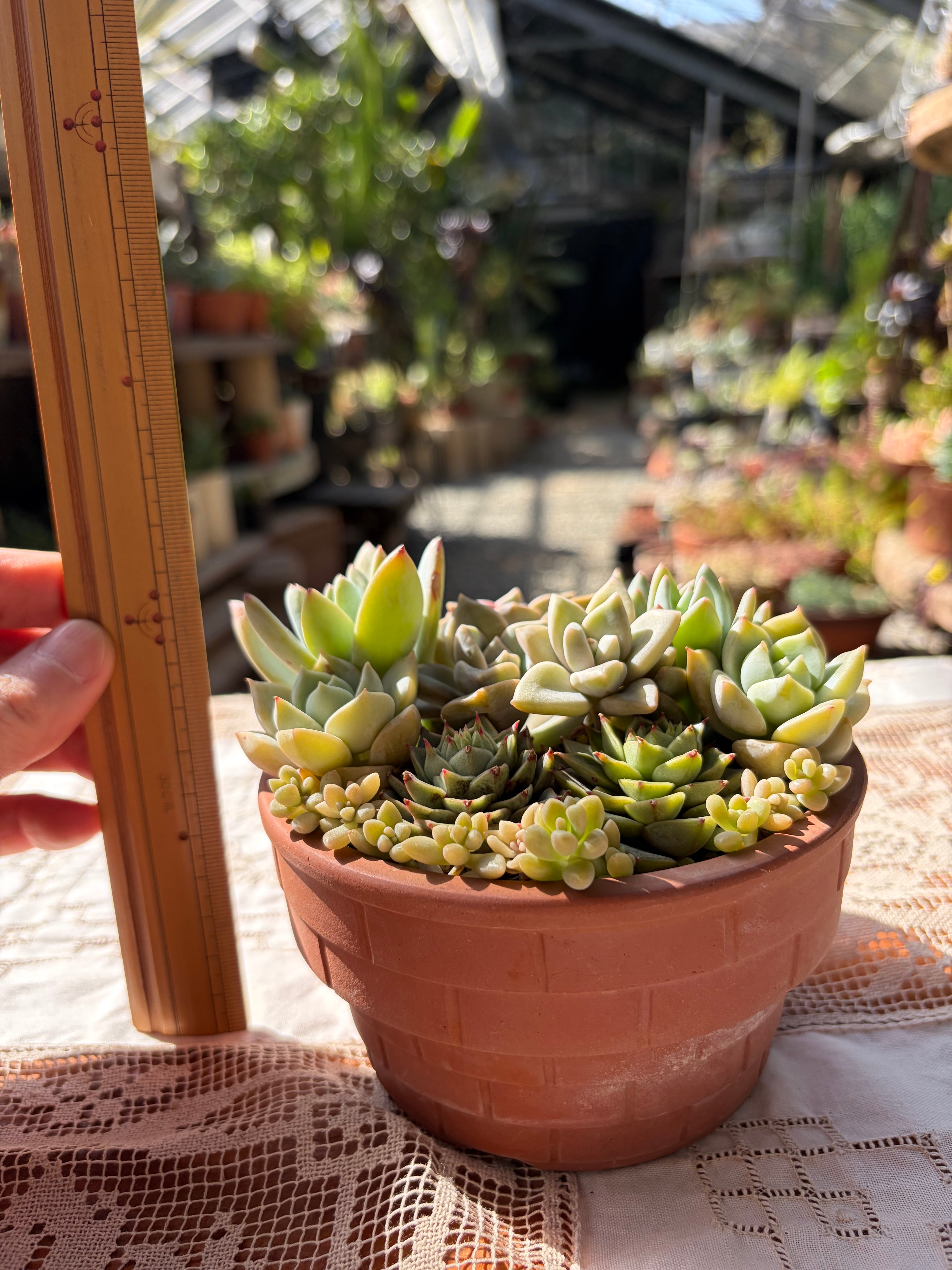 コンパクトなサイズ感です。水やりは春から秋にかけて土の表面が乾いたらたっぷり行い、冬場はやや控えめにすることで多肉植物たちの健康を維持しましょう。明るい環境を好む多肉植物ですが、真夏の直射日光には十分注意が必要です。風通しの良い場所が、元気に育つコツです。