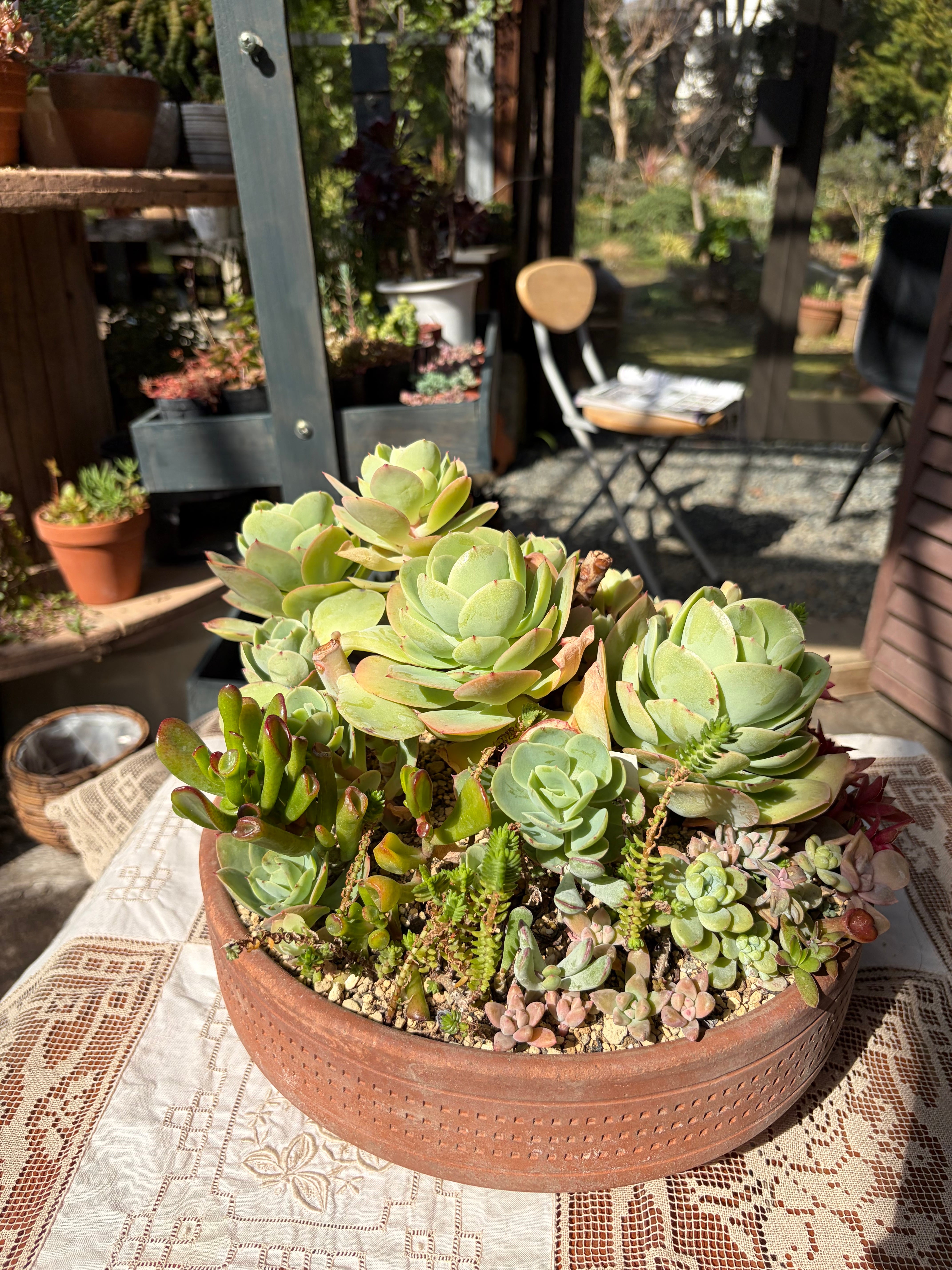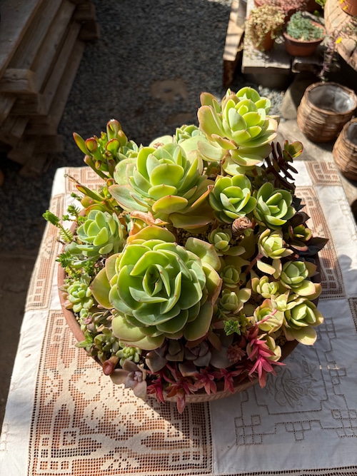 直径30cmの大きな鉢は、深い味わいのあるテラコッタ素材を使用しており、温かみのある雰囲気を演出します。水やりは春から秋にかけて土の表面が乾いたらしっかり行い、冬場は控えめにすることで多肉たちの健康を維持しましょう。明るい場所を好む多肉植物ですが、真夏の直射日光にはご注意ください。風通しの良い場所で育てることで、より元気に育つことができます。