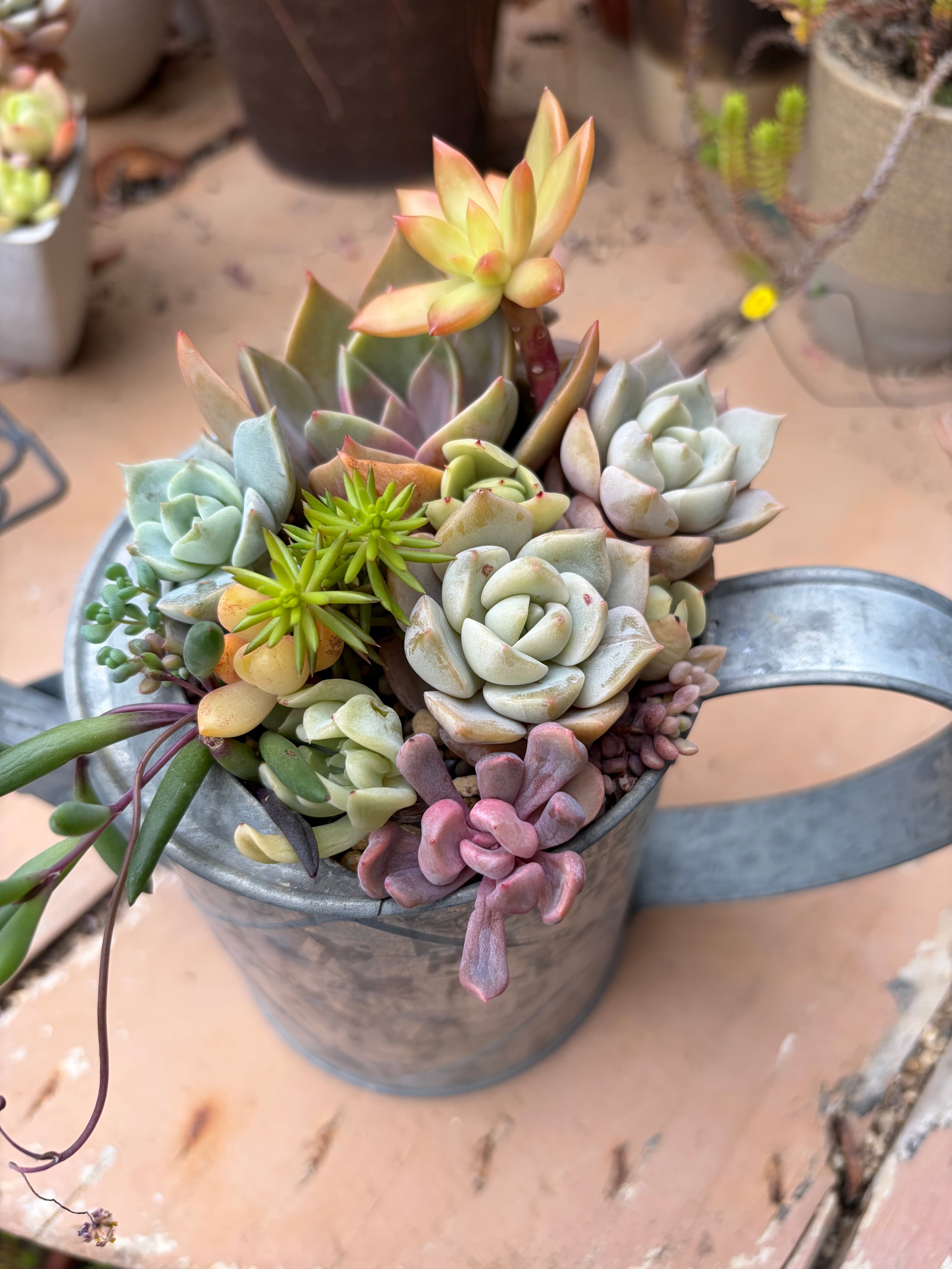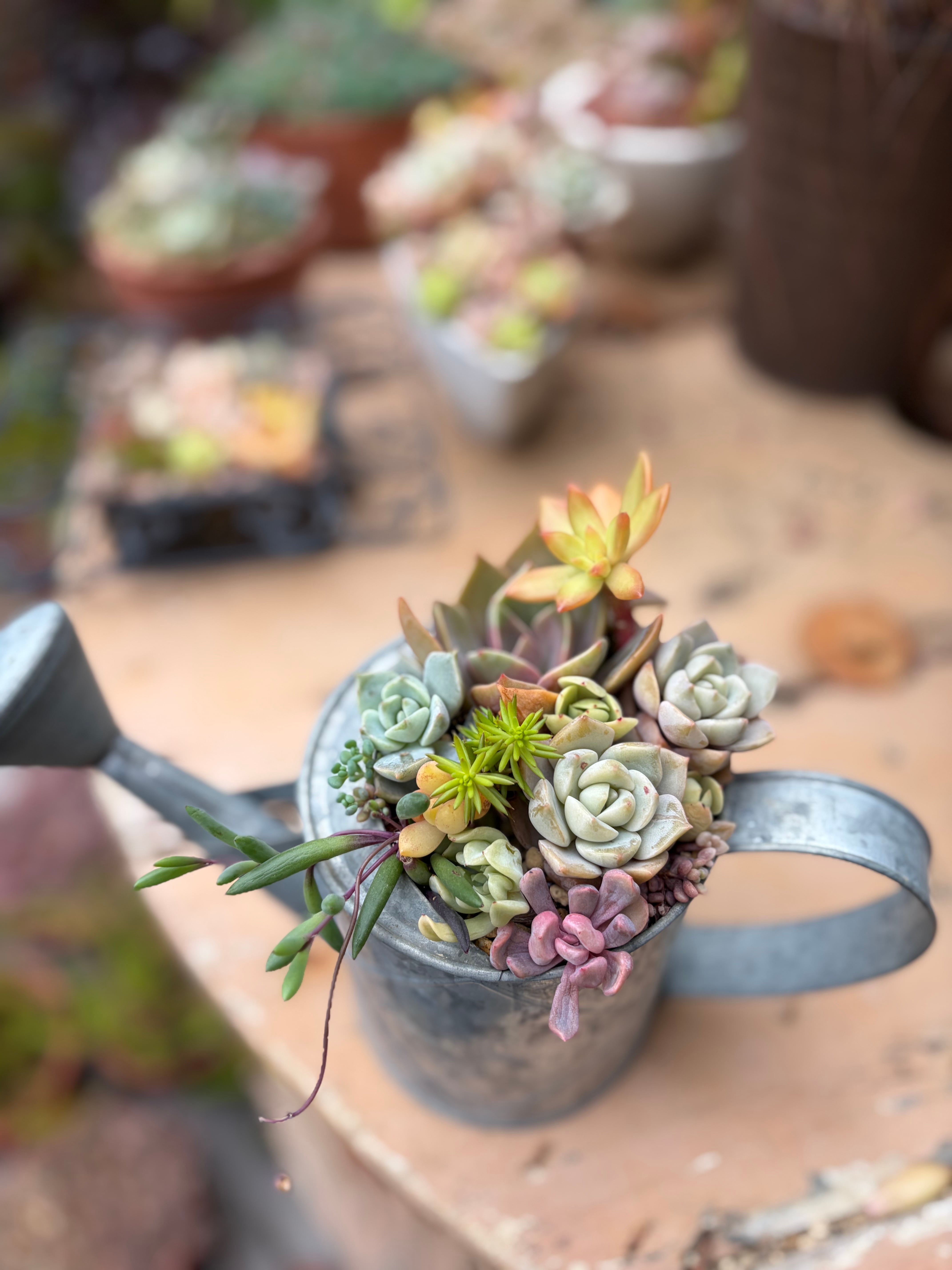 おうちで育てるのにも最適なので、初めての方でも安心です。癒しの空間を演出してくれるブリキジョロに寄せ植えA。是非、新たな植物の世界をお楽しみください。
