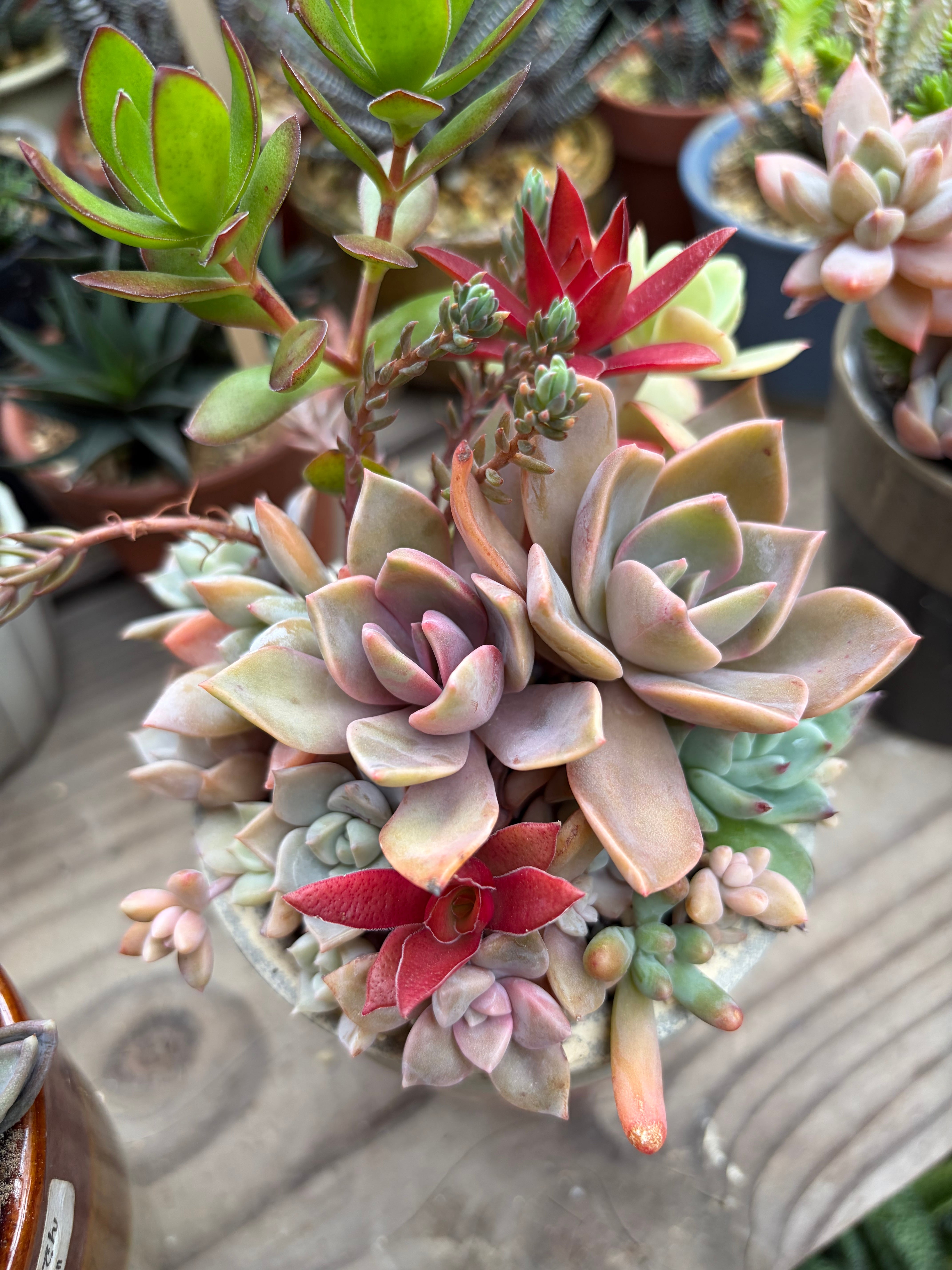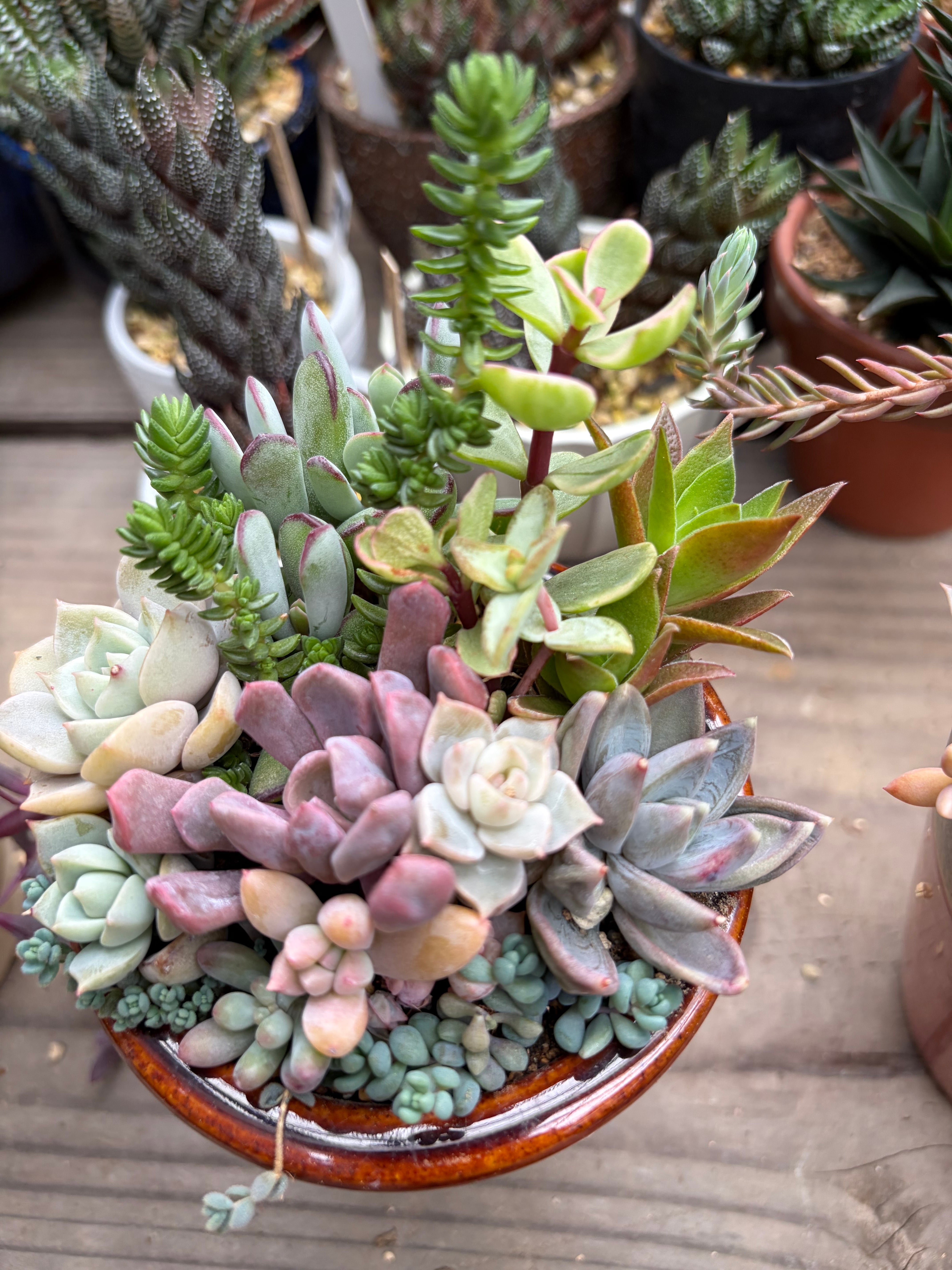 セダム、グラプトベリア、エケベリア、クラッスラなどいろいろ組み合わせたミックス鉢です。